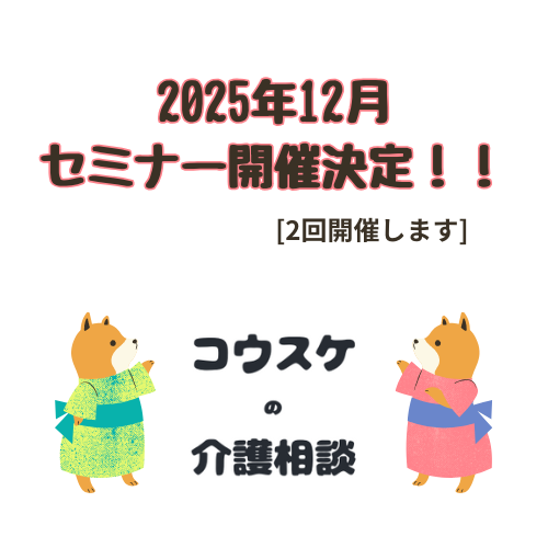 こんにちは♪ コウスケの介護相談では、在宅介護をされているご家族様向けに、2025年12月に2回セミナーを開催します。 介護の勉強がしたい方・ご両親の介護を今後行う上で不安材料を少しでも解消したい方・現在進行形で介護をしていて○○に困ってい...
